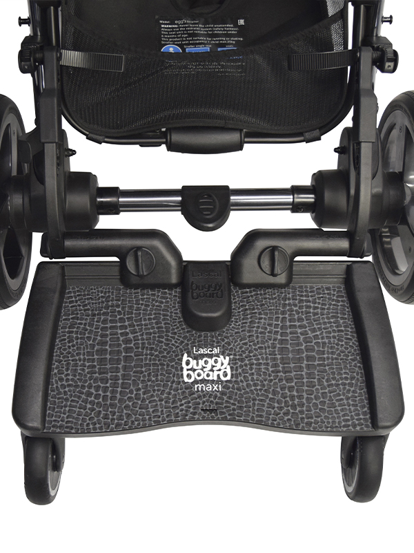 Please note, this website and product imagery is designed to show you the wide variety of applications and flexibility of the BuggyBoard on a range of pushchair models. It is not exhaustive and is regularly updated. The BuggyBoard has been designed with functionality in mind, so our illustrative examples are intended to show you that the BuggyBoard can be mounted successfully onto almost every pushchair model. It is important that any child using the BuggyBoard has enough space to stand comfortably. However, due to the number of combinations possible across pushchair brands (regarding positioning of carrycots, whether seats are forward/rear facing, the ability of the pushchair handle to slide out, accessories you may have attached etc.) we are unable to illustrate everything. Only you can recognise if your child has enough space to stand comfortably. Similarly, if you use a BuggyBoard Saddle, the seat accessory designed for use with the BuggyBoard Maxi, you need to be sure that your child has adequate space to sit/stand comfortably. They should always sit rear facing. Before each use, please show your child where they should hold onto the pushchair or Saddle to avoid any fingertraps that may be accessible at the back of your pushchair.