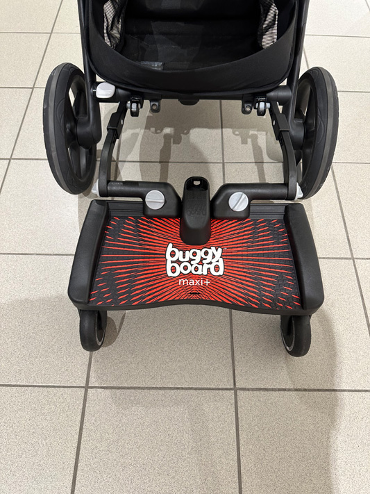 Please note, this website and product imagery is designed to show you the wide variety of applications and flexibility of the BuggyBoard on a range of pushchair models. It is not exhaustive and is regularly updated. The BuggyBoard has been designed with functionality in mind, so our illustrative examples are intended to show you that the BuggyBoard can be mounted successfully onto almost every pushchair model. It is important that any child using the BuggyBoard has enough space to stand comfortably. However, due to the number of combinations possible across pushchair brands (regarding positioning of carrycots, whether seats are forward/rear facing, the ability of the pushchair handle to slide out, accessories you may have attached etc.) we are unable to illustrate everything. Only you can recognise if your child has enough space to stand comfortably. Similarly, if you use a BuggyBoard Saddle, the seat accessory designed for use with the BuggyBoard Maxi, you need to be sure that your child has adequate space to sit/stand comfortably. They should always sit rear facing. Before each use, please show your child where they should hold onto the pushchair or Saddle to avoid any fingertraps that may be accessible at the back of your pushchair.