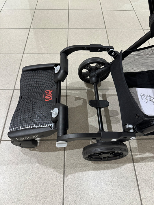 Please note, this website and product imagery is designed to show you the wide variety of applications and flexibility of the BuggyBoard on a range of pushchair models. It is not exhaustive and is regularly updated. The BuggyBoard has been designed with functionality in mind, so our illustrative examples are intended to show you that the BuggyBoard can be mounted successfully onto almost every pushchair model. It is important that any child using the BuggyBoard has enough space to stand comfortably. However, due to the number of combinations possible across pushchair brands (regarding positioning of carrycots, whether seats are forward/rear facing, the ability of the pushchair handle to slide out, accessories you may have attached etc.) we are unable to illustrate everything. Only you can recognise if your child has enough space to stand comfortably. Similarly, if you use a BuggyBoard Saddle, the seat accessory designed for use with the BuggyBoard Maxi, you need to be sure that your child has adequate space to sit/stand comfortably. They should always sit rear facing. Before each use, please show your child where they should hold onto the pushchair or Saddle to avoid any fingertraps that may be accessible at the back of your pushchair.