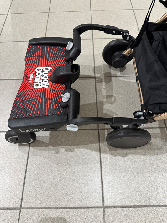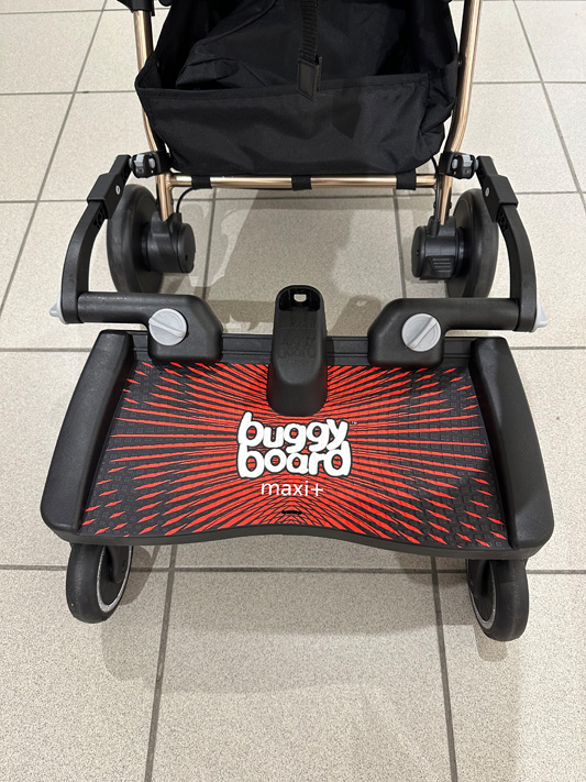 Please note, this website and product imagery is designed to show you the wide variety of applications and flexibility of the BuggyBoard on a range of pushchair models. It is not exhaustive and is regularly updated. The BuggyBoard has been designed with functionality in mind, so our illustrative examples are intended to show you that the BuggyBoard can be mounted successfully onto almost every pushchair model. It is important that any child using the BuggyBoard has enough space to stand comfortably. However, due to the number of combinations possible across pushchair brands (regarding positioning of carrycots, whether seats are forward/rear facing, the ability of the pushchair handle to slide out, accessories you may have attached etc.) we are unable to illustrate everything. Only you can recognise if your child has enough space to stand comfortably. Similarly, if you use a BuggyBoard Saddle, the seat accessory designed for use with the BuggyBoard Maxi, you need to be sure that your child has adequate space to sit/stand comfortably. They should always sit rear facing. Before each use, please show your child where they should hold onto the pushchair or Saddle to avoid any fingertraps that may be accessible at the back of your pushchair.