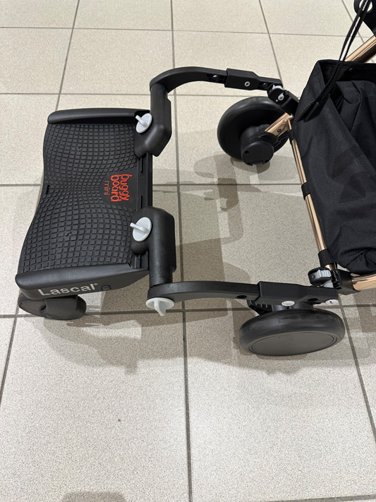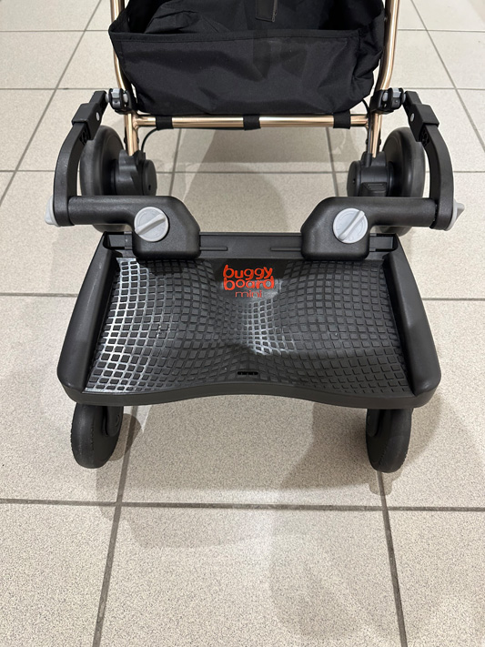 Please note, this website and product imagery is designed to show you the wide variety of applications and flexibility of the BuggyBoard on a range of pushchair models. It is not exhaustive and is regularly updated. The BuggyBoard has been designed with functionality in mind, so our illustrative examples are intended to show you that the BuggyBoard can be mounted successfully onto almost every pushchair model. It is important that any child using the BuggyBoard has enough space to stand comfortably. However, due to the number of combinations possible across pushchair brands (regarding positioning of carrycots, whether seats are forward/rear facing, the ability of the pushchair handle to slide out, accessories you may have attached etc.) we are unable to illustrate everything. Only you can recognise if your child has enough space to stand comfortably. Similarly, if you use a BuggyBoard Saddle, the seat accessory designed for use with the BuggyBoard Maxi, you need to be sure that your child has adequate space to sit/stand comfortably. They should always sit rear facing. Before each use, please show your child where they should hold onto the pushchair or Saddle to avoid any fingertraps that may be accessible at the back of your pushchair.