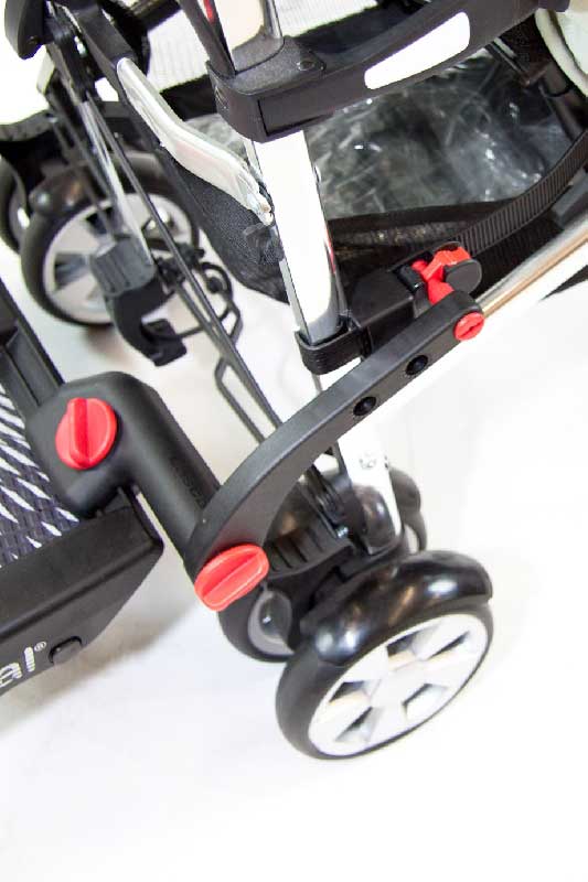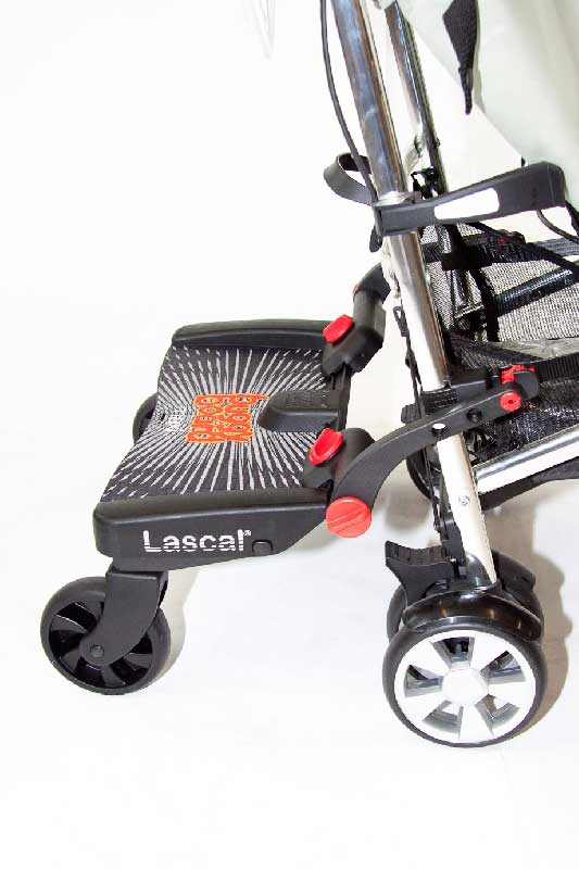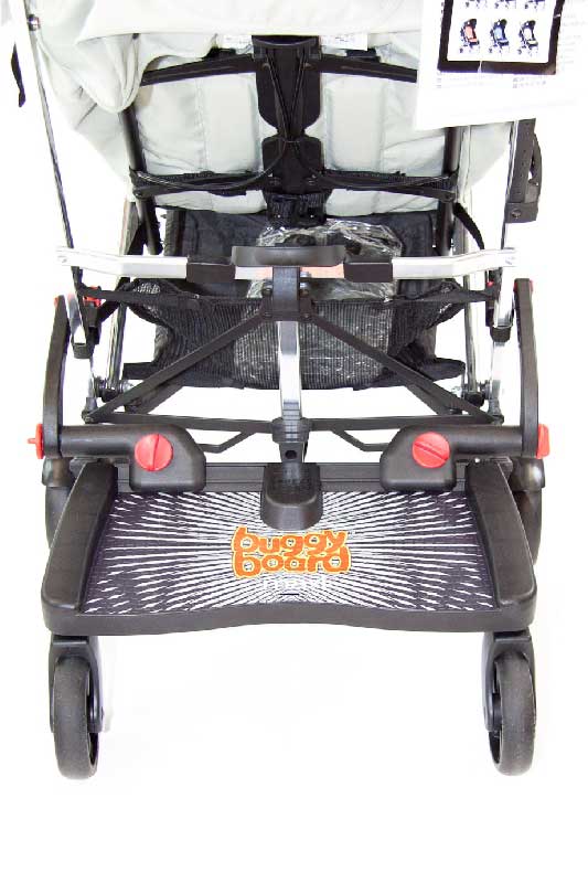 Please note, this website and product imagery is designed to show you the wide variety of applications and flexibility of the BuggyBoard on a range of pushchair models. It is not exhaustive and is regularly updated. The BuggyBoard has been designed with functionality in mind, so our illustrative examples are intended to show you that the BuggyBoard can be mounted successfully onto almost every pushchair model. It is important that any child using the BuggyBoard has enough space to stand comfortably. However, due to the number of combinations possible across pushchair brands (regarding positioning of carrycots, whether seats are forward/rear facing, the ability of the pushchair handle to slide out, accessories you may have attached etc.) we are unable to illustrate everything. Only you can recognise if your child has enough space to stand comfortably. Similarly, if you use a BuggyBoard Saddle, the seat accessory designed for use with the BuggyBoard Maxi, you need to be sure that your child has adequate space to sit/stand comfortably. They should always sit rear facing. Before each use, please show your child where they should hold onto the pushchair or Saddle to avoid any fingertraps that may be accessible at the back of your pushchair.