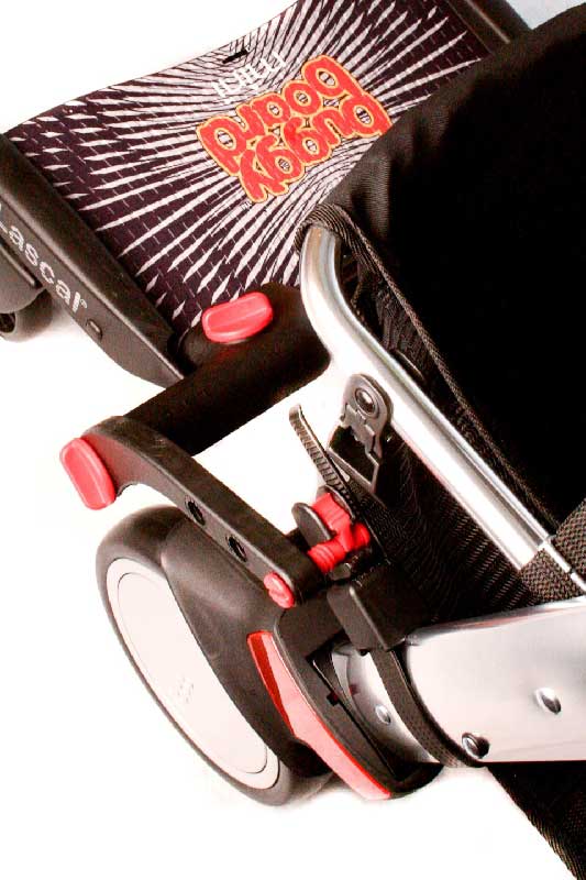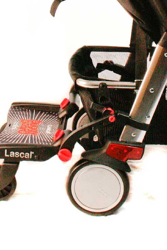 Das Kind kann bequem stehen, wenn die Rückenlehne vollständig zurückgeklappt ist oder aufrecht steht. In der zurückgeklappten Position benötigt das BuggyBoard Armverlängerungen und das Kind muss hinter den Griffen des Kinderwagens stehen.