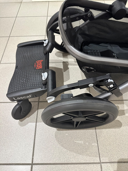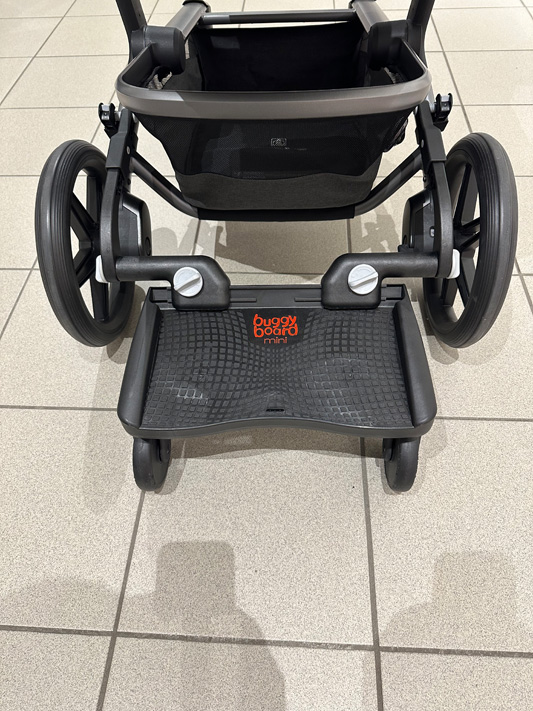 Please note, this website and product imagery is designed to show you the wide variety of applications and flexibility of the BuggyBoard on a range of pushchair models. It is not exhaustive and is regularly updated. The BuggyBoard has been designed with functionality in mind, so our illustrative examples are intended to show you that the BuggyBoard can be mounted successfully onto almost every pushchair model. It is important that any child using the BuggyBoard has enough space to stand comfortably. However, due to the number of combinations possible across pushchair brands (regarding positioning of carrycots, whether seats are forward/rear facing, the ability of the pushchair handle to slide out, accessories you may have attached etc.) we are unable to illustrate everything. Only you can recognise if your child has enough space to stand comfortably. Similarly, if you use a BuggyBoard Saddle, the seat accessory designed for use with the BuggyBoard Maxi, you need to be sure that your child has adequate space to sit/stand comfortably. They should always sit rear facing. Before each use, please show your child where they should hold onto the pushchair or Saddle to avoid any fingertraps that may be accessible at the back of your pushchair.
