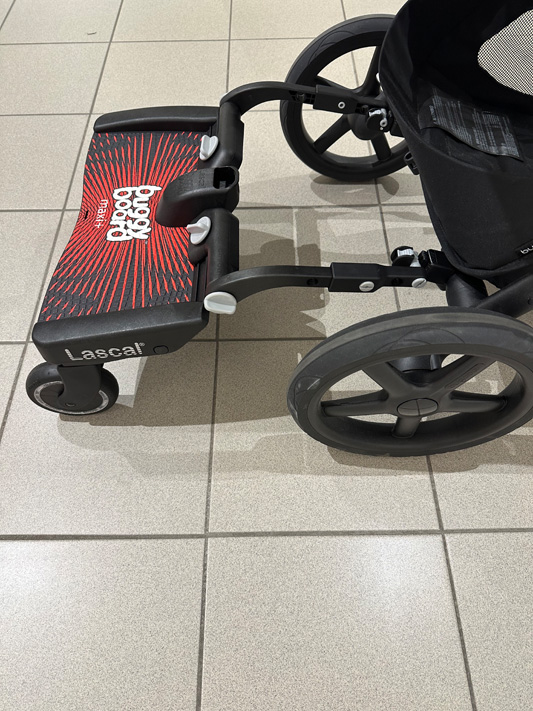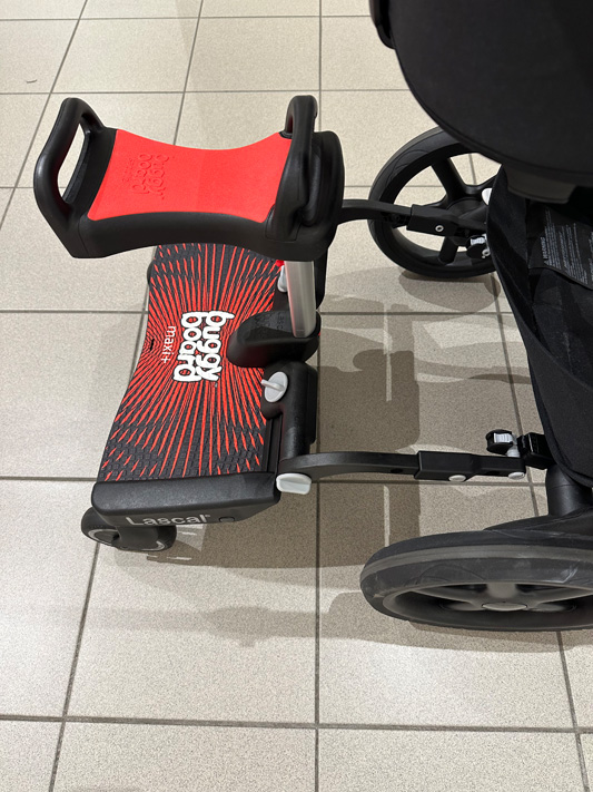 Please note, this website and product imagery is designed to show you the wide variety of applications and flexibility of the BuggyBoard on a range of pushchair models. It is not exhaustive and is regularly updated. The BuggyBoard has been designed with functionality in mind, so our illustrative examples are intended to show you that the BuggyBoard can be mounted successfully onto almost every pushchair model. It is important that any child using the BuggyBoard has enough space to stand comfortably. However, due to the number of combinations possible across pushchair brands (regarding positioning of carrycots, whether seats are forward/rear facing, the ability of the pushchair handle to slide out, accessories you may have attached etc.) we are unable to illustrate everything. Only you can recognise if your child has enough space to stand comfortably. Similarly, if you use a BuggyBoard Saddle, the seat accessory designed for use with the BuggyBoard Maxi, you need to be sure that your child has adequate space to sit/stand comfortably. They should always sit rear facing. Before each use, please show your child where they should hold onto the pushchair or Saddle to avoid any fingertraps that may be accessible at the back of your pushchair.