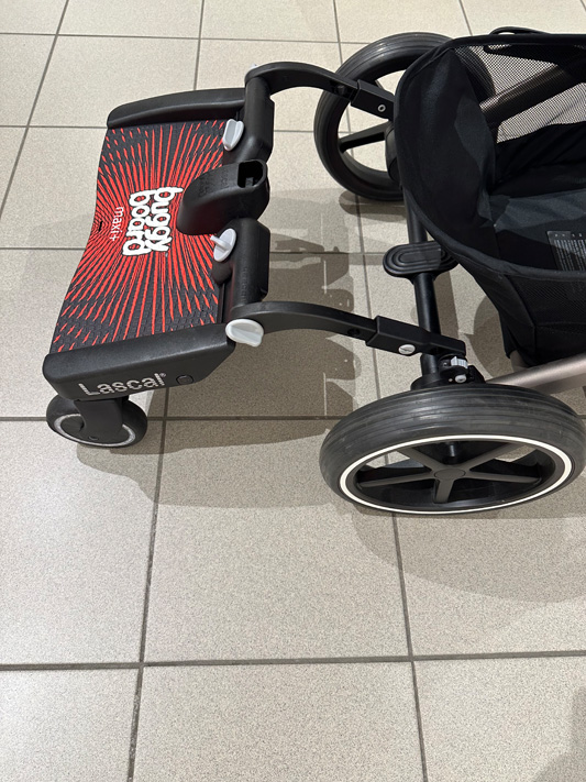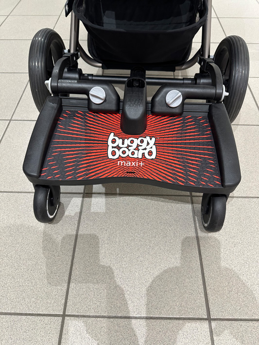Please note, this website and product imagery is designed to show you the wide variety of applications and flexibility of the BuggyBoard on a range of pushchair models. It is not exhaustive and is regularly updated. The BuggyBoard has been designed with functionality in mind, so our illustrative examples are intended to show you that the BuggyBoard can be mounted successfully onto almost every pushchair model. It is important that any child using the BuggyBoard has enough space to stand comfortably. However, due to the number of combinations possible across pushchair brands (regarding positioning of carrycots, whether seats are forward/rear facing, the ability of the pushchair handle to slide out, accessories you may have attached etc.) we are unable to illustrate everything. Only you can recognise if your child has enough space to stand comfortably. Similarly, if you use a BuggyBoard Saddle, the seat accessory designed for use with the BuggyBoard Maxi, you need to be sure that your child has adequate space to sit/stand comfortably. They should always sit rear facing. Before each use, please show your child where they should hold onto the pushchair or Saddle to avoid any fingertraps that may be accessible at the back of your pushchair.