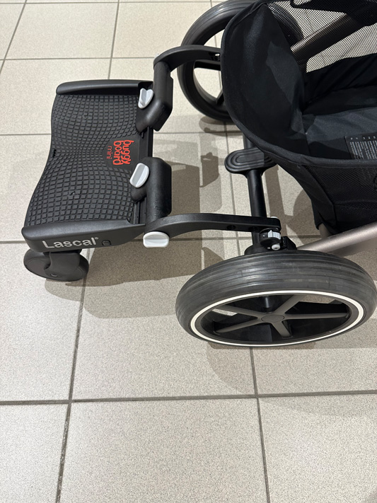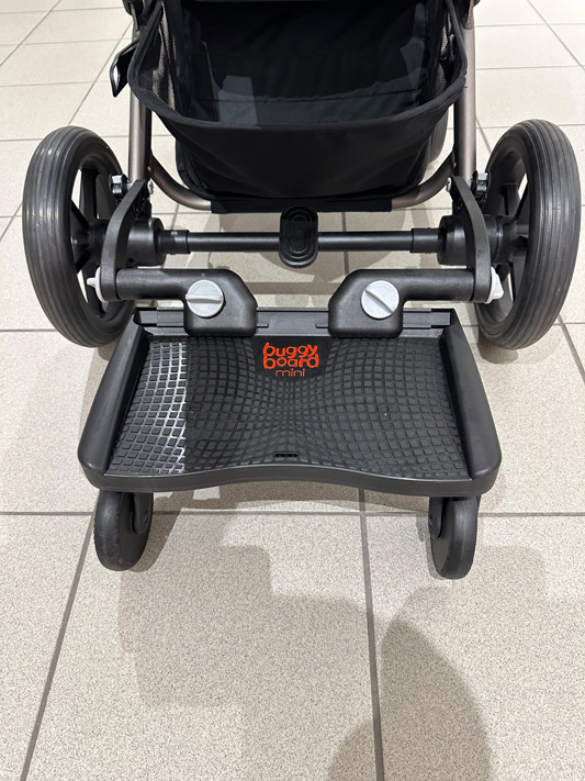 Please note, this website and product imagery is designed to show you the wide variety of applications and flexibility of the BuggyBoard on a range of pushchair models. It is not exhaustive and is regularly updated. The BuggyBoard has been designed with functionality in mind, so our illustrative examples are intended to show you that the BuggyBoard can be mounted successfully onto almost every pushchair model. It is important that any child using the BuggyBoard has enough space to stand comfortably. However, due to the number of combinations possible across pushchair brands (regarding positioning of carrycots, whether seats are forward/rear facing, the ability of the pushchair handle to slide out, accessories you may have attached etc.) we are unable to illustrate everything. Only you can recognise if your child has enough space to stand comfortably. Similarly, if you use a BuggyBoard Saddle, the seat accessory designed for use with the BuggyBoard Maxi, you need to be sure that your child has adequate space to sit/stand comfortably. They should always sit rear facing. Before each use, please show your child where they should hold onto the pushchair or Saddle to avoid any fingertraps that may be accessible at the back of your pushchair.