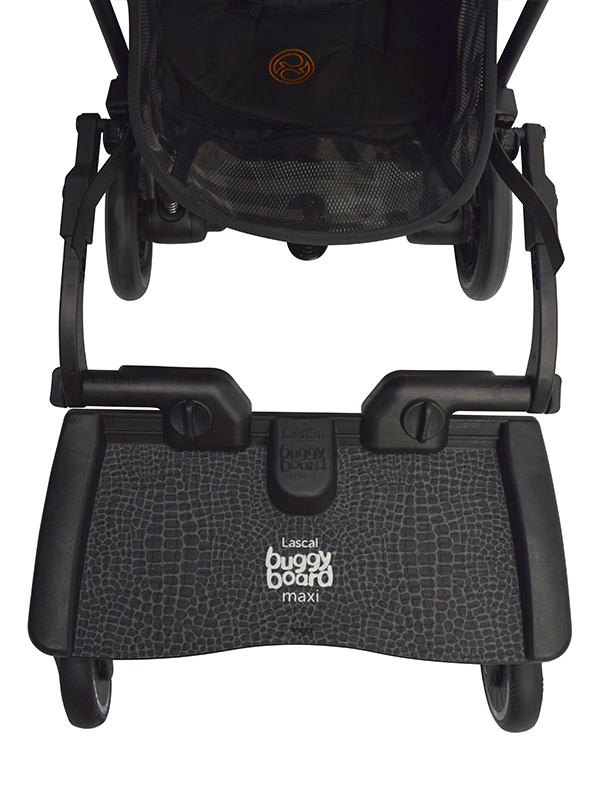 Please note, this website and product imagery is designed to show you the wide variety of applications and flexibility of the BuggyBoard on a range of pushchair models. It is not exhaustive and is regularly updated. The BuggyBoard has been designed with functionality in mind, so our illustrative examples are intended to show you that the BuggyBoard can be mounted successfully onto almost every pushchair model. It is important that any child using the BuggyBoard has enough space to stand comfortably. However, due to the number of combinations possible across pushchair brands (regarding positioning of carrycots, whether seats are forward/rear facing, the ability of the pushchair handle to slide out, accessories you may have attached etc.) we are unable to illustrate everything. Only you can recognise if your child has enough space to stand comfortably. Similarly, if you use a BuggyBoard Saddle, the seat accessory designed for use with the BuggyBoard Maxi, you need to be sure that your child has adequate space to sit/stand comfortably. They should always sit rear facing. Before each use, please show your child where they should hold onto the pushchair or Saddle to avoid any fingertraps that may be accessible at the back of your pushchair.