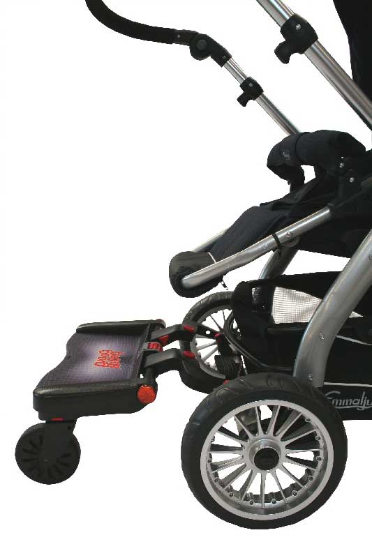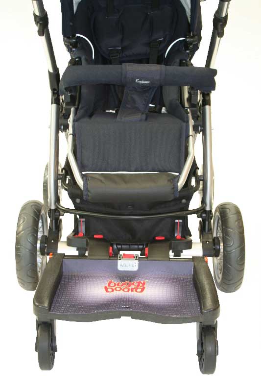 Please note, this website and product imagery is designed to show you the wide variety of applications and flexibility of the BuggyBoard on a range of pushchair models. It is not exhaustive and is regularly updated. The BuggyBoard has been designed with functionality in mind, so our illustrative examples are intended to show you that the BuggyBoard can be mounted successfully onto almost every pushchair model. It is important that any child using the BuggyBoard has enough space to stand comfortably. However, due to the number of combinations possible across pushchair brands (regarding positioning of carrycots, whether seats are forward/rear facing, the ability of the pushchair handle to slide out, accessories you may have attached etc.) we are unable to illustrate everything. Only you can recognise if your child has enough space to stand comfortably. Similarly, if you use a BuggyBoard Saddle, the seat accessory designed for use with the BuggyBoard Maxi, you need to be sure that your child has adequate space to sit/stand comfortably. They should always sit rear facing. Before each use, please show your child where they should hold onto the pushchair or Saddle to avoid any fingertraps that may be accessible at the back of your pushchair.