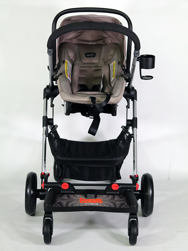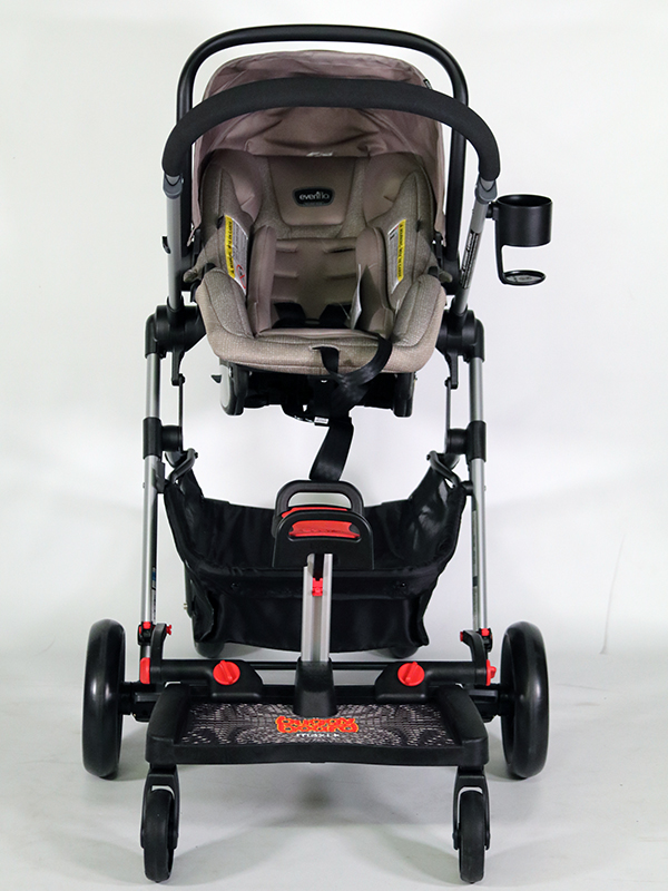 Please note, this website and product imagery is designed to show you the wide variety of applications and flexibility of the BuggyBoard on a range of pushchair models. It is not exhaustive and is regularly updated. The BuggyBoard has been designed with functionality in mind, so our illustrative examples are intended to show you that the BuggyBoard can be mounted successfully onto almost every pushchair model. It is important that any child using the BuggyBoard has enough space to stand comfortably. However, due to the number of combinations possible across pushchair brands (regarding positioning of carrycots, whether seats are forward/rear facing, the ability of the pushchair handle to slide out, accessories you may have attached etc.) we are unable to illustrate everything. Only you can recognise if your child has enough space to stand comfortably. Similarly, if you use a BuggyBoard Saddle, the seat accessory designed for use with the BuggyBoard Maxi, you need to be sure that your child has adequate space to sit/stand comfortably. They should always sit rear facing. Before each use, please show your child where they should hold onto the pushchair or Saddle to avoid any fingertraps that may be accessible at the back of your pushchair.