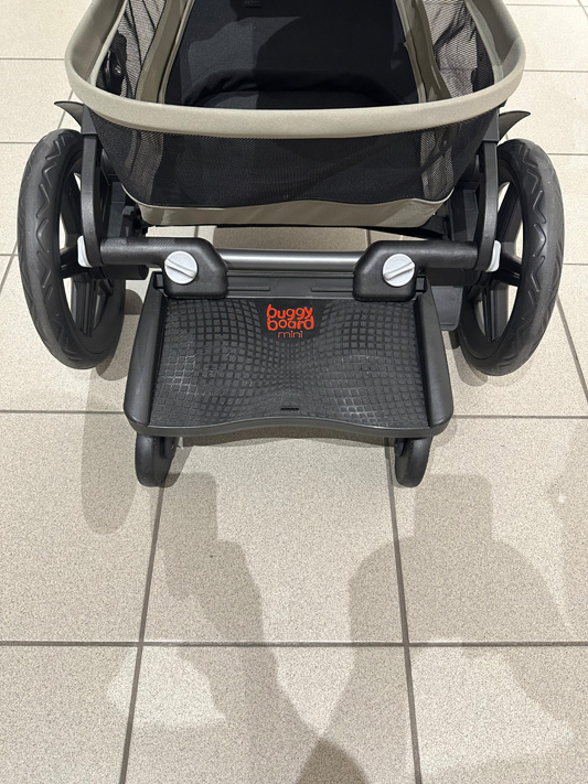 Please note, this website and product imagery is designed to show you the wide variety of applications and flexibility of the BuggyBoard on a range of pushchair models. It is not exhaustive and is regularly updated. The BuggyBoard has been designed with functionality in mind, so our illustrative examples are intended to show you that the BuggyBoard can be mounted successfully onto almost every pushchair model. It is important that any child using the BuggyBoard has enough space to stand comfortably. However, due to the number of combinations possible across pushchair brands (regarding positioning of carrycots, whether seats are forward/rear facing, the ability of the pushchair handle to slide out, accessories you may have attached etc.) we are unable to illustrate everything. Only you can recognise if your child has enough space to stand comfortably. Similarly, if you use a BuggyBoard Saddle, the seat accessory designed for use with the BuggyBoard Maxi, you need to be sure that your child has adequate space to sit/stand comfortably. They should always sit rear facing. Before each use, please show your child where they should hold onto the pushchair or Saddle to avoid any fingertraps that may be accessible at the back of your pushchair.