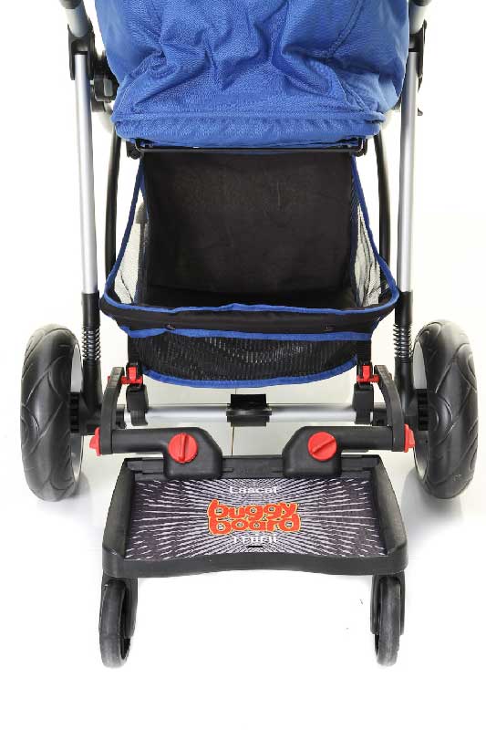 Please note, this website and product imagery is designed to show you the wide variety of applications and flexibility of the BuggyBoard on a range of pushchair models. It is not exhaustive and is regularly updated. The BuggyBoard has been designed with functionality in mind, so our illustrative examples are intended to show you that the BuggyBoard can be mounted successfully onto almost every pushchair model. It is important that any child using the BuggyBoard has enough space to stand comfortably. However, due to the number of combinations possible across pushchair brands (regarding positioning of carrycots, whether seats are forward/rear facing, the ability of the pushchair handle to slide out, accessories you may have attached etc.) we are unable to illustrate everything. Only you can recognise if your child has enough space to stand comfortably. Similarly, if you use a BuggyBoard Saddle, the seat accessory designed for use with the BuggyBoard Maxi, you need to be sure that your child has adequate space to sit/stand comfortably. They should always sit rear facing. Before each use, please show your child where they should hold onto the pushchair or Saddle to avoid any fingertraps that may be accessible at the back of your pushchair.