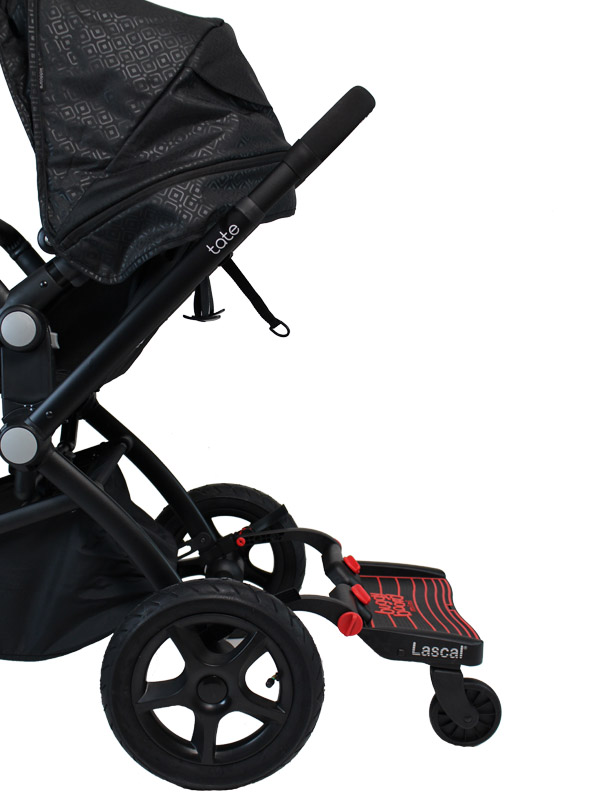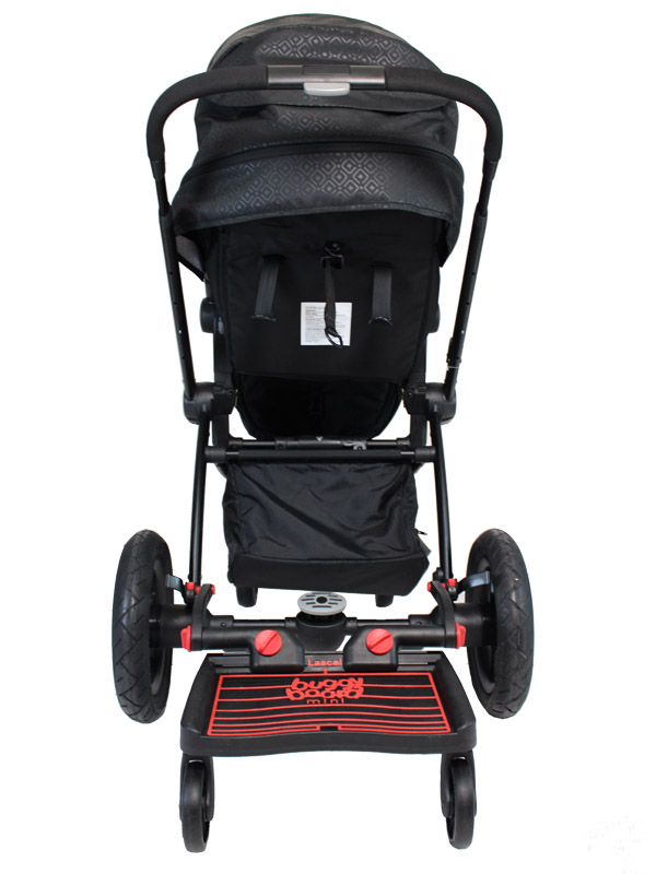 Please note, this website and product imagery is designed to show you the wide variety of applications and flexibility of the BuggyBoard on a range of pushchair models. It is not exhaustive and is regularly updated. The BuggyBoard has been designed with functionality in mind, so our illustrative examples are intended to show you that the BuggyBoard can be mounted successfully onto almost every pushchair model. It is important that any child using the BuggyBoard has enough space to stand comfortably. However, due to the number of combinations possible across pushchair brands (regarding positioning of carrycots, whether seats are forward/rear facing, the ability of the pushchair handle to slide out, accessories you may have attached etc.) we are unable to illustrate everything. Only you can recognise if your child has enough space to stand comfortably. Similarly, if you use a BuggyBoard Saddle, the seat accessory designed for use with the BuggyBoard Maxi, you need to be sure that your child has adequate space to sit/stand comfortably. They should always sit rear facing. Before each use, please show your child where they should hold onto the pushchair or Saddle to avoid any fingertraps that may be accessible at the back of your pushchair.