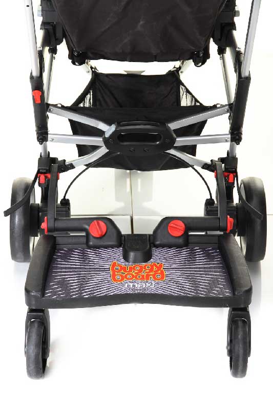 Please note, this website and product imagery is designed to show you the wide variety of applications and flexibility of the BuggyBoard on a range of pushchair models. It is not exhaustive and is regularly updated. The BuggyBoard has been designed with functionality in mind, so our illustrative examples are intended to show you that the BuggyBoard can be mounted successfully onto almost every pushchair model. It is important that any child using the BuggyBoard has enough space to stand comfortably. However, due to the number of combinations possible across pushchair brands (regarding positioning of carrycots, whether seats are forward/rear facing, the ability of the pushchair handle to slide out, accessories you may have attached etc.) we are unable to illustrate everything. Only you can recognise if your child has enough space to stand comfortably. Similarly, if you use a BuggyBoard Saddle, the seat accessory designed for use with the BuggyBoard Maxi, you need to be sure that your child has adequate space to sit/stand comfortably. They should always sit rear facing. Before each use, please show your child where they should hold onto the pushchair or Saddle to avoid any fingertraps that may be accessible at the back of your pushchair.