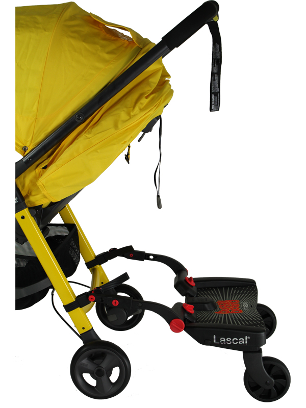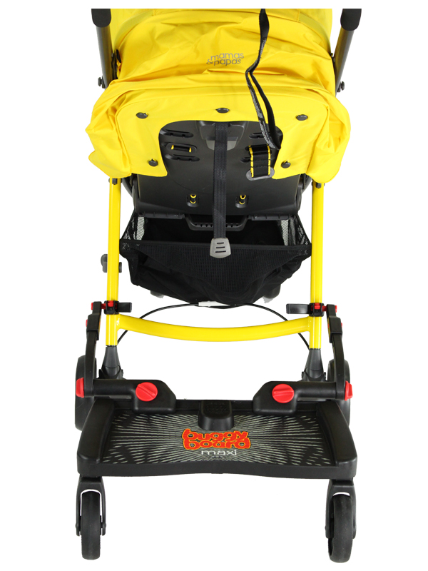 Please note, this website and product imagery is designed to show you the wide variety of applications and flexibility of the BuggyBoard on a range of pushchair models. It is not exhaustive and is regularly updated. The BuggyBoard has been designed with functionality in mind, so our illustrative examples are intended to show you that the BuggyBoard can be mounted successfully onto almost every pushchair model. It is important that any child using the BuggyBoard has enough space to stand comfortably. However, due to the number of combinations possible across pushchair brands (regarding positioning of carrycots, whether seats are forward/rear facing, the ability of the pushchair handle to slide out, accessories you may have attached etc.) we are unable to illustrate everything. Only you can recognise if your child has enough space to stand comfortably. Similarly, if you use a BuggyBoard Saddle, the seat accessory designed for use with the BuggyBoard Maxi, you need to be sure that your child has adequate space to sit/stand comfortably. They should always sit rear facing. Before each use, please show your child where they should hold onto the pushchair or Saddle to avoid any fingertraps that may be accessible at the back of your pushchair.