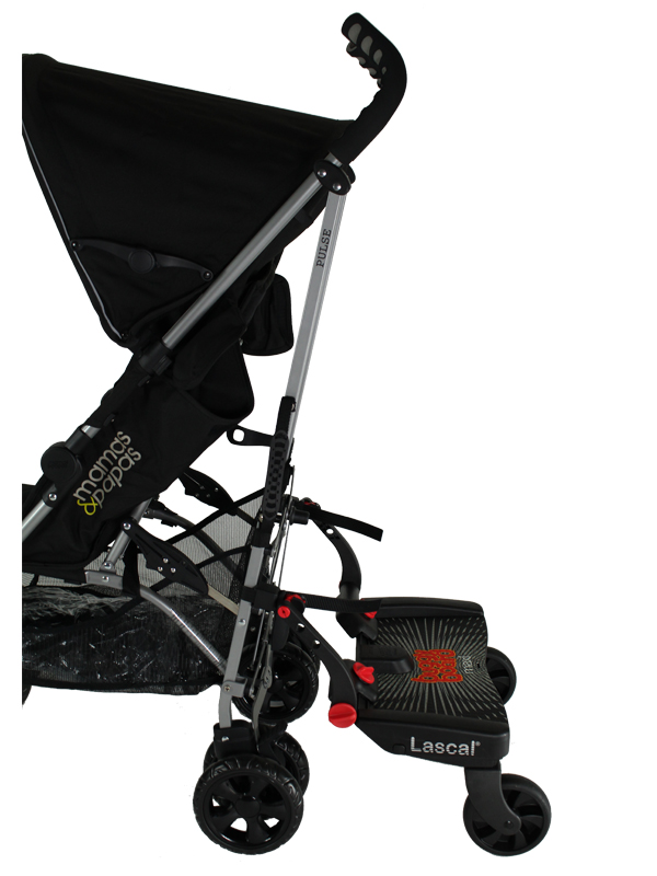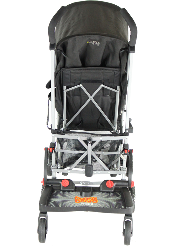 Please note, this website and product imagery is designed to show you the wide variety of applications and flexibility of the BuggyBoard on a range of pushchair models. It is not exhaustive and is regularly updated. The BuggyBoard has been designed with functionality in mind, so our illustrative examples are intended to show you that the BuggyBoard can be mounted successfully onto almost every pushchair model. It is important that any child using the BuggyBoard has enough space to stand comfortably. However, due to the number of combinations possible across pushchair brands (regarding positioning of carrycots, whether seats are forward/rear facing, the ability of the pushchair handle to slide out, accessories you may have attached etc.) we are unable to illustrate everything. Only you can recognise if your child has enough space to stand comfortably. Similarly, if you use a BuggyBoard Saddle, the seat accessory designed for use with the BuggyBoard Maxi, you need to be sure that your child has adequate space to sit/stand comfortably. They should always sit rear facing. Before each use, please show your child where they should hold onto the pushchair or Saddle to avoid any fingertraps that may be accessible at the back of your pushchair.