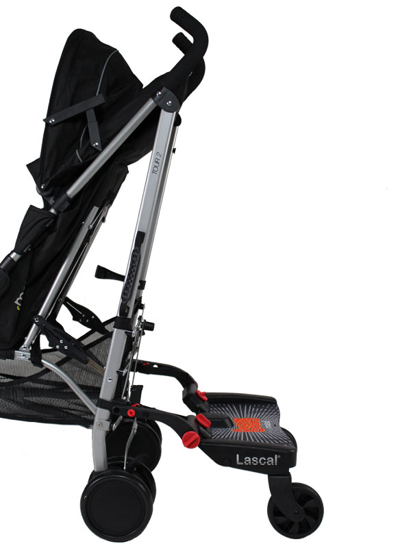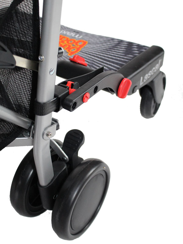 Please note, this website and product imagery is designed to show you the wide variety of applications and flexibility of the BuggyBoard on a range of pushchair models. It is not exhaustive and is regularly updated. The BuggyBoard has been designed with functionality in mind, so our illustrative examples are intended to show you that the BuggyBoard can be mounted successfully onto almost every pushchair model. It is important that any child using the BuggyBoard has enough space to stand comfortably. However, due to the number of combinations possible across pushchair brands (regarding positioning of carrycots, whether seats are forward/rear facing, the ability of the pushchair handle to slide out, accessories you may have attached etc.) we are unable to illustrate everything. Only you can recognise if your child has enough space to stand comfortably. Similarly, if you use a BuggyBoard Saddle, the seat accessory designed for use with the BuggyBoard Maxi, you need to be sure that your child has adequate space to sit/stand comfortably. They should always sit rear facing. Before each use, please show your child where they should hold onto the pushchair or Saddle to avoid any fingertraps that may be accessible at the back of your pushchair.