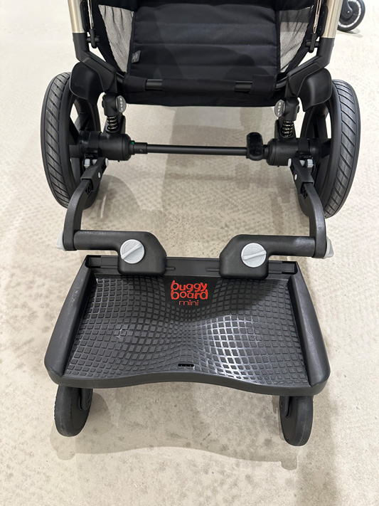 Please note, this website and product imagery is designed to show you the wide variety of applications and flexibility of the BuggyBoard on a range of pushchair models. It is not exhaustive and is regularly updated. The BuggyBoard has been designed with functionality in mind, so our illustrative examples are intended to show you that the BuggyBoard can be mounted successfully onto almost every pushchair model. It is important that any child using the BuggyBoard has enough space to stand comfortably. However, due to the number of combinations possible across pushchair brands (regarding positioning of carrycots, whether seats are forward/rear facing, the ability of the pushchair handle to slide out, accessories you may have attached etc.) we are unable to illustrate everything. Only you can recognise if your child has enough space to stand comfortably. Similarly, if you use a BuggyBoard Saddle, the seat accessory designed for use with the BuggyBoard Maxi, you need to be sure that your child has adequate space to sit/stand comfortably. They should always sit rear facing. Before each use, please show your child where they should hold onto the pushchair or Saddle to avoid any fingertraps that may be accessible at the back of your pushchair.